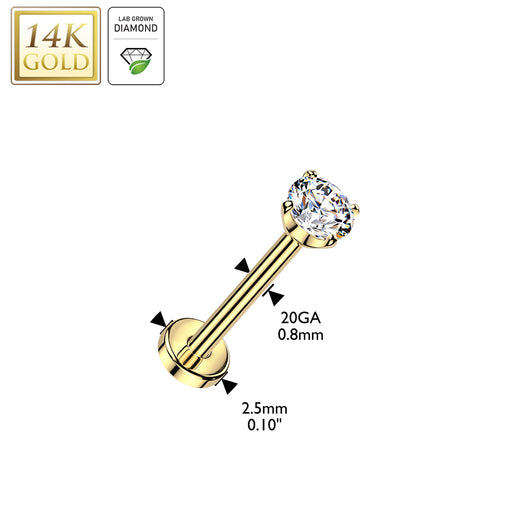 14K Gold Threadless Push In 20ga Flat Back Stud With Round Prong Set Lab Grown Diamond